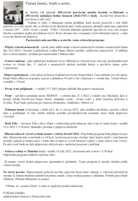 na letošní rok připadá 200.výročí posvěcení našeho kostela sv.Matouše a 255.výročí zakládací listiny farnosti (20.8.1767) i školy. Kostel byl dostavěn a posvěcen 8.září 1822.