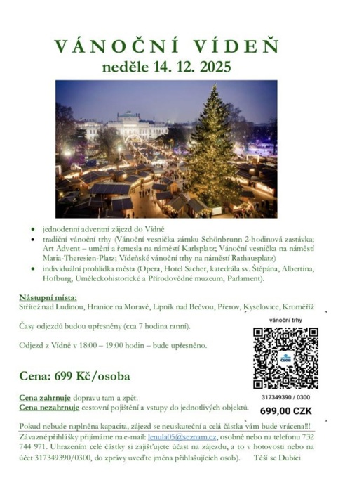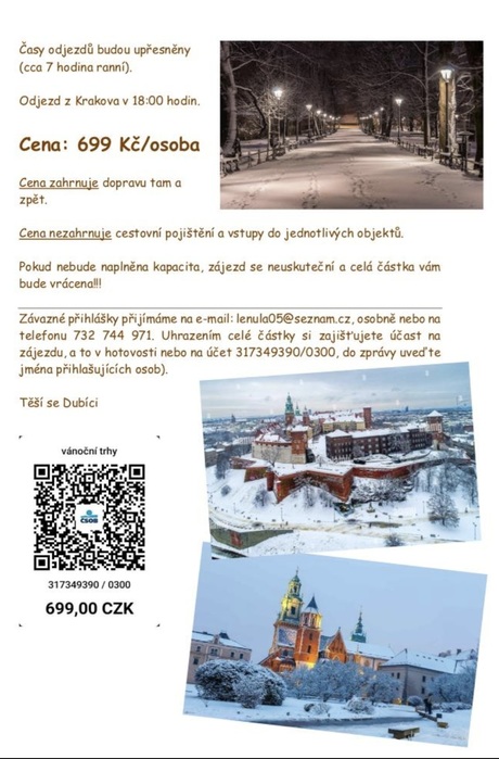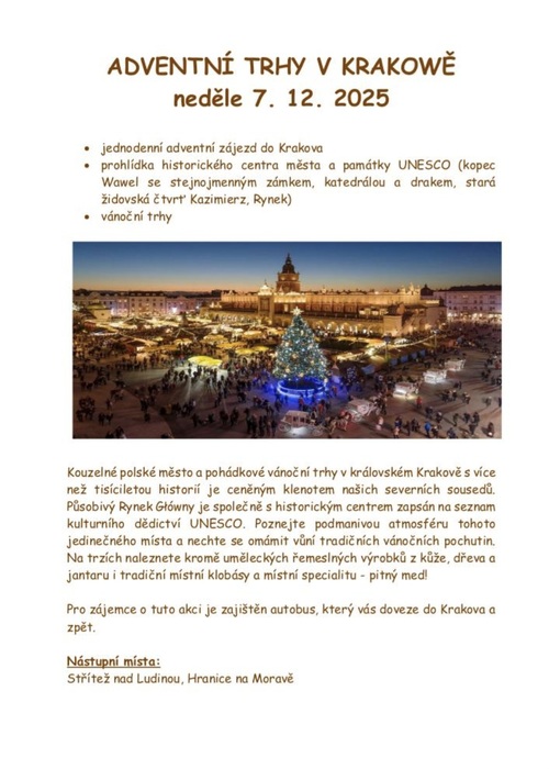 Vánoční Vídeň i město Krakow jsou krásným naladěním na vánoční období. Informace naleznete v přiloženém letáku.