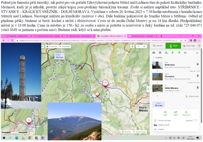 Pokud jste fanoušci pěší turistiky, tak právě pro vás pořádá Tělovýchovná jednota Střítež nad Ludinou túru do pohoří Králického Sněžníku. Možností, kudy jít je několik, protože zdejší kopce jsou protkány turistickými trasami. Zvolit si můžete například tuto: STŘÍBRNICE – ŠTVANICE – KRÁLICKÝ SNĚŽNÍK – DOLNÍ MORAVA. Vyrážíme v sobotu 20. května 2023 v 7:30 hodin autobusem z horního konce Stříteže nad Ludinou. Nastoupit můžete na kterékoliv zastávce v obci. Dále budeme pokračovat do Starého Města a Stříbrnic. Odtud už půjdeme pěšky, budeme se bavit, kochat a určitě i občerstvovat. Cesta až do areálu Dolní Moravy je asi 18 km dlouhá. Předpokládaný návrat je v 18:00 hodin. Cena za autobus je 150,- Kč za osobu a místo je potřeba si rezervovat u Jirky Jordána na tel. čísle 725 048 071 (stačí SMS se jménem a počtem míst). Budeme rádi, když se k nám přidáte.