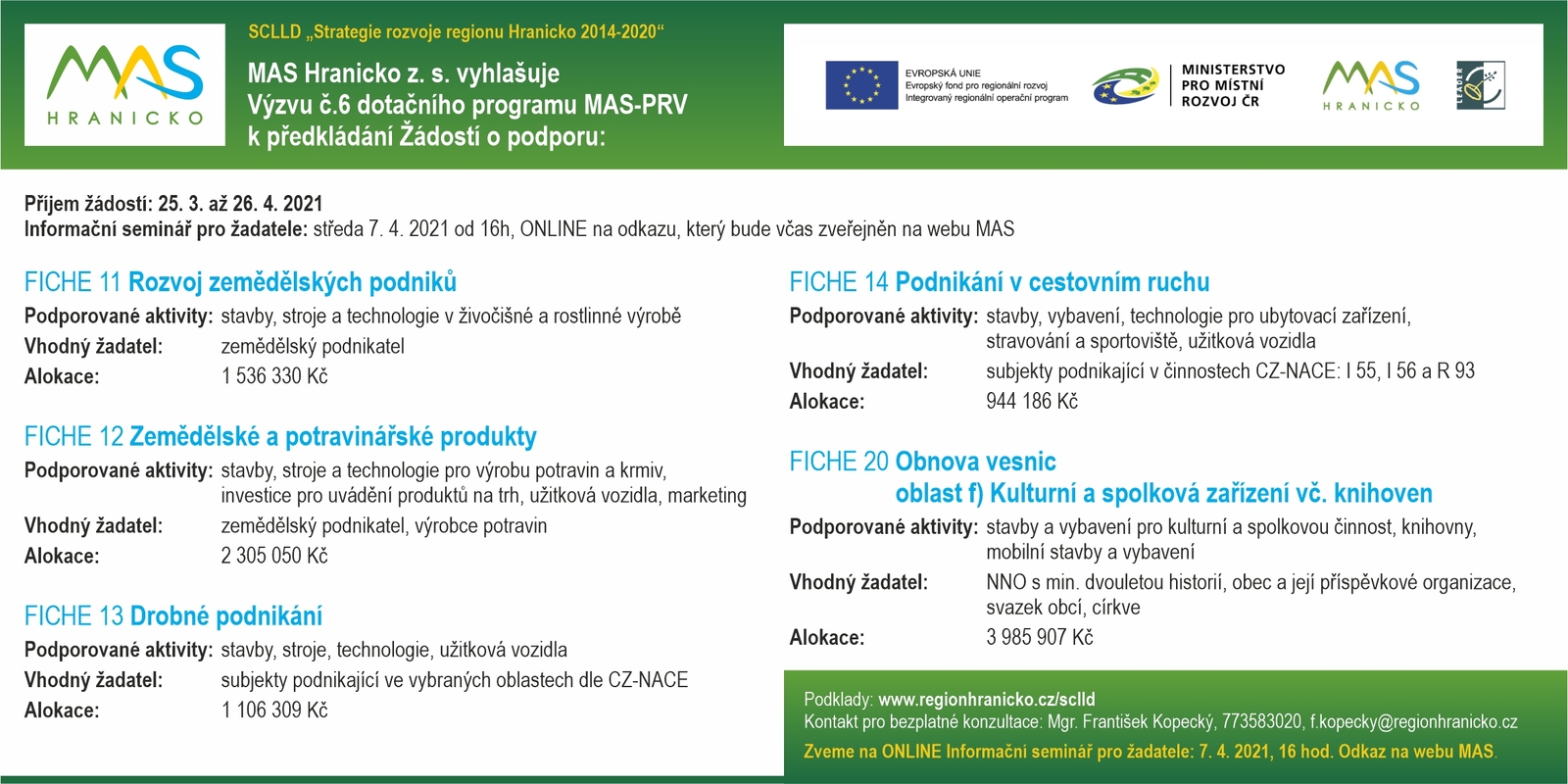 MAS Hranicko dne 25.3. vyhlásila Výzvu č.6 dotačního programu MAS-PRV (Program rozvoje venkova). Výzva potrvá do 26.4.2021 a MAS v rámci ní rozdělí rekordní částku 9 877 782,- Kč. Podpořeny budou žádosti o dotaci v 5 fichích (oblastech) včetně očekávané Fiche 20 zaměřené na podporu spolkového a kulturního zázemí.